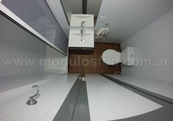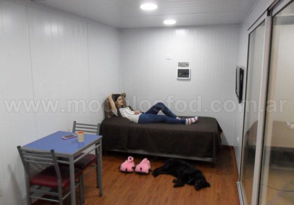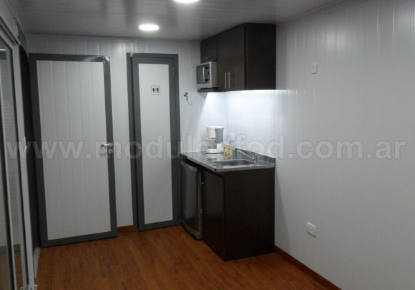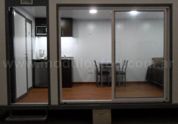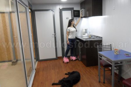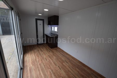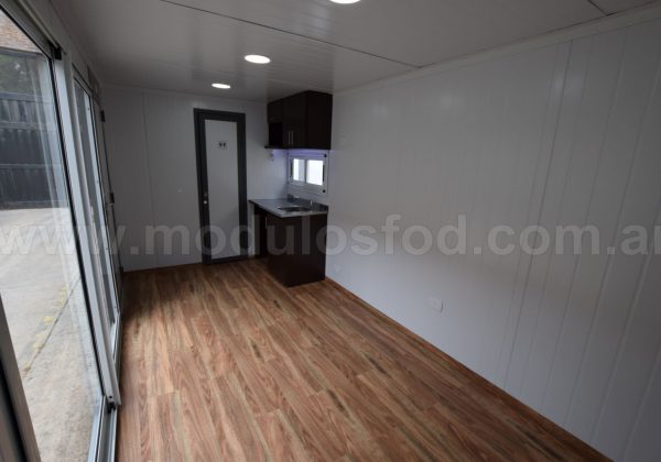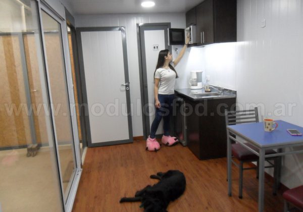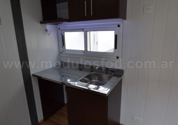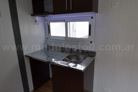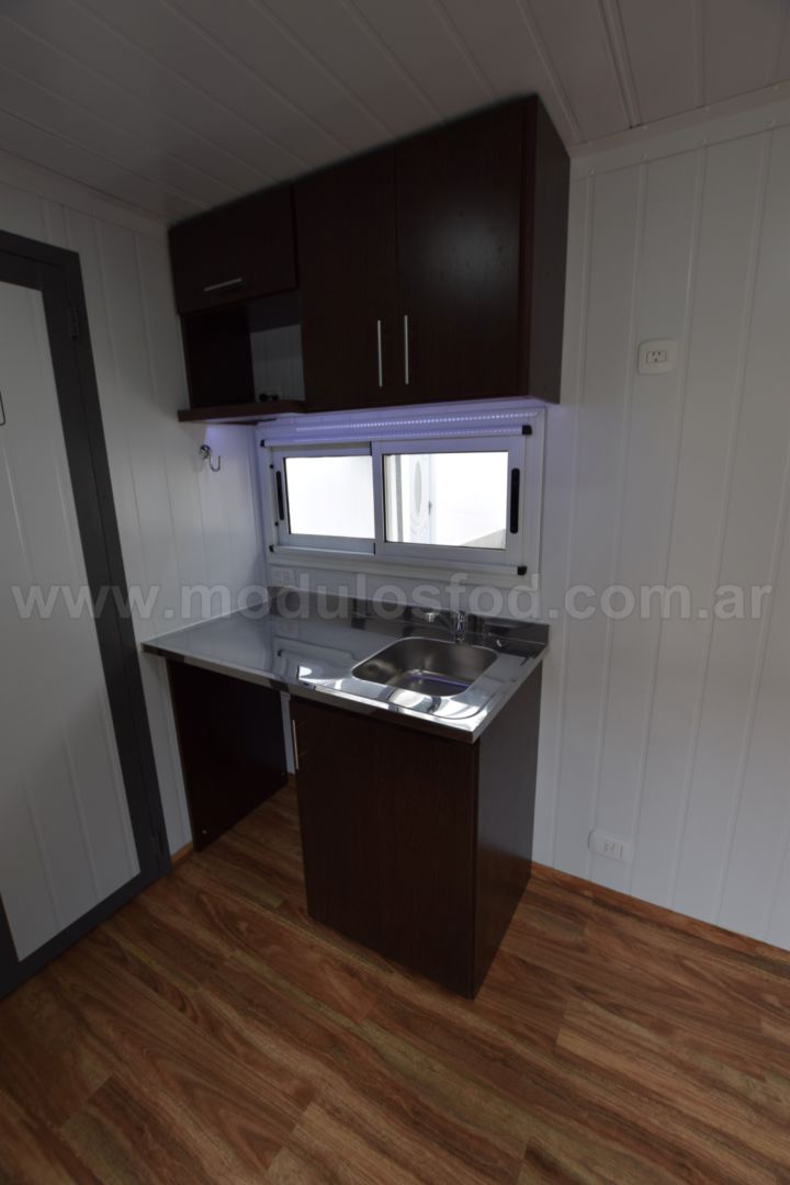 Cocina con mueble bajo mesada con espacio para heladera, y termotanque eléctrico (incluido), mesada de acero inoxidable y grifería monocomando. Mueble sobre mesada con espacio para microondas.